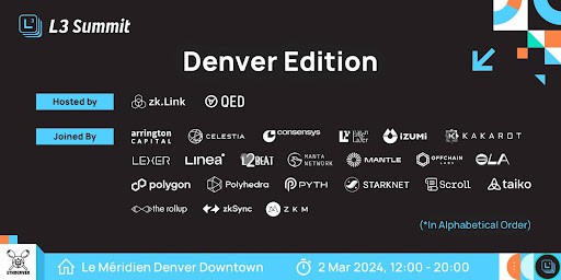 zkLink and QED will be hosting its second L3 Summit at ETHDenver on March 2nd, 2024 at the Le Meridien Hotel in Downtown Denver.