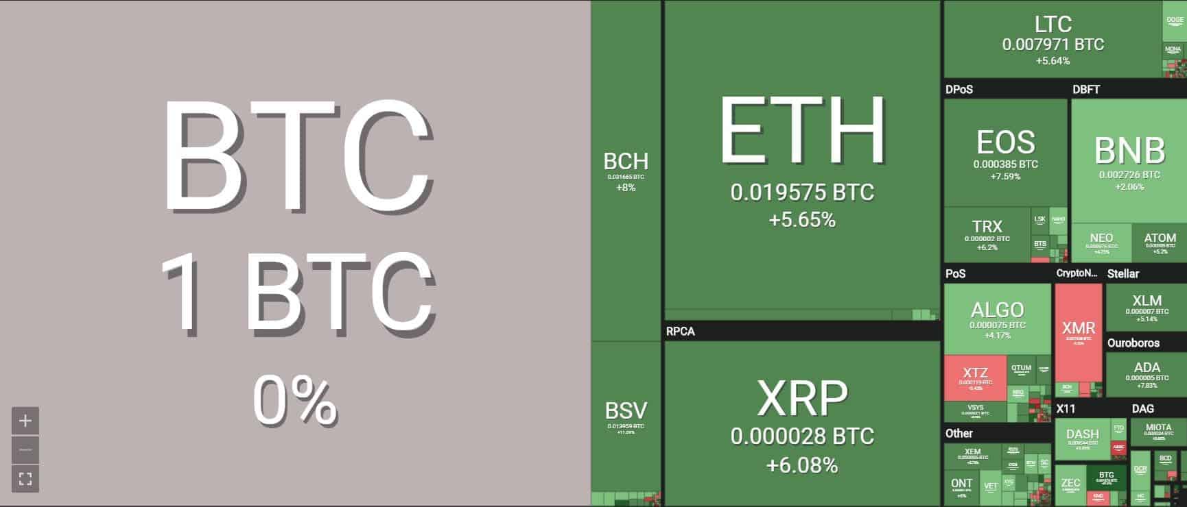 Ethereum is up almost 6%, while Ripple (XRP) is up around 5.3%. Another major gainer today is Bitcoin SV (BSV) which is up more than 10% against Bitcoin.