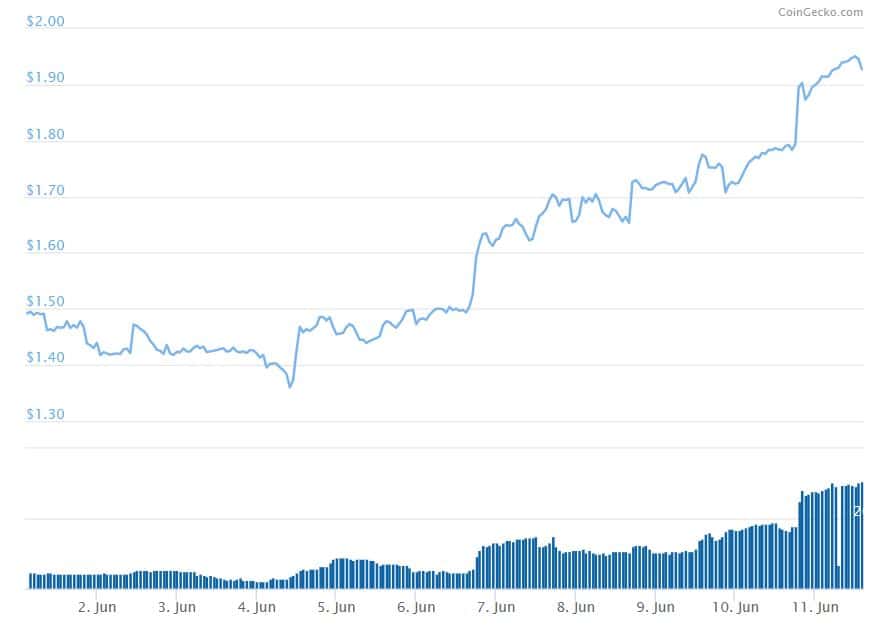 Just a few days ago, Cryptopotato reported that Bitfinex’s LEO token is up 70% since its private sale. Today, the total gains amount to 90 percent as LEO is currently trading at around $1.90, sitting at a market capitalization upwards of $1.9 billion.Looking at the chart since the start of June, we can see that the month has been nothing but good for LEO. It’s up almost 30 percent since the beginning of June alone, marking 8 percent gains on the day as well.