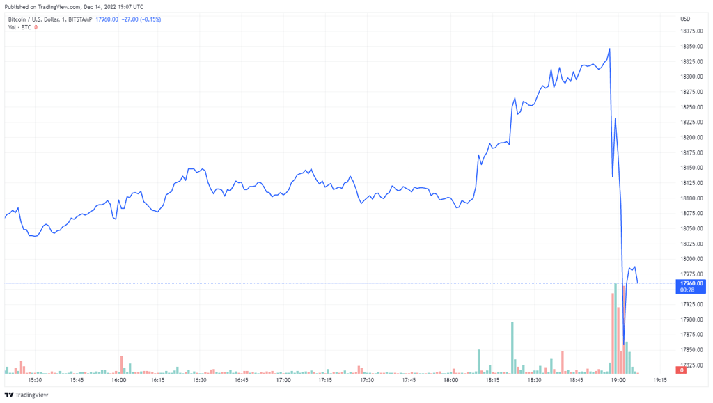 - As the Federal Reserve unveiled its decision at 14:00 EDT, Bitcoin immediately fell from $18,300 to $17,850 within five minutes.