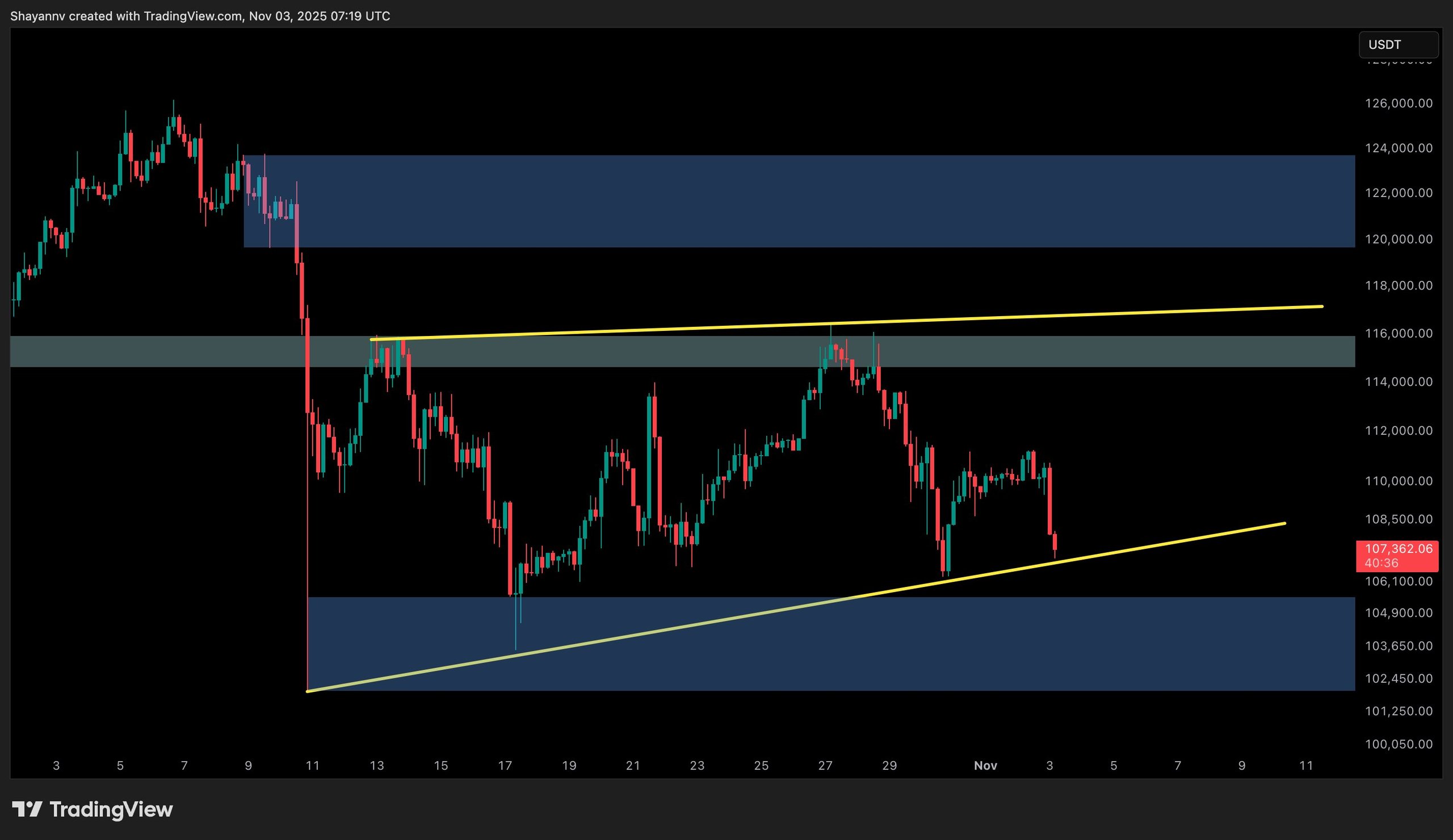 The 4-hour chart highlights the current ascending wedge formation, with BTC retesting the lower trendline near the $106K support zone.