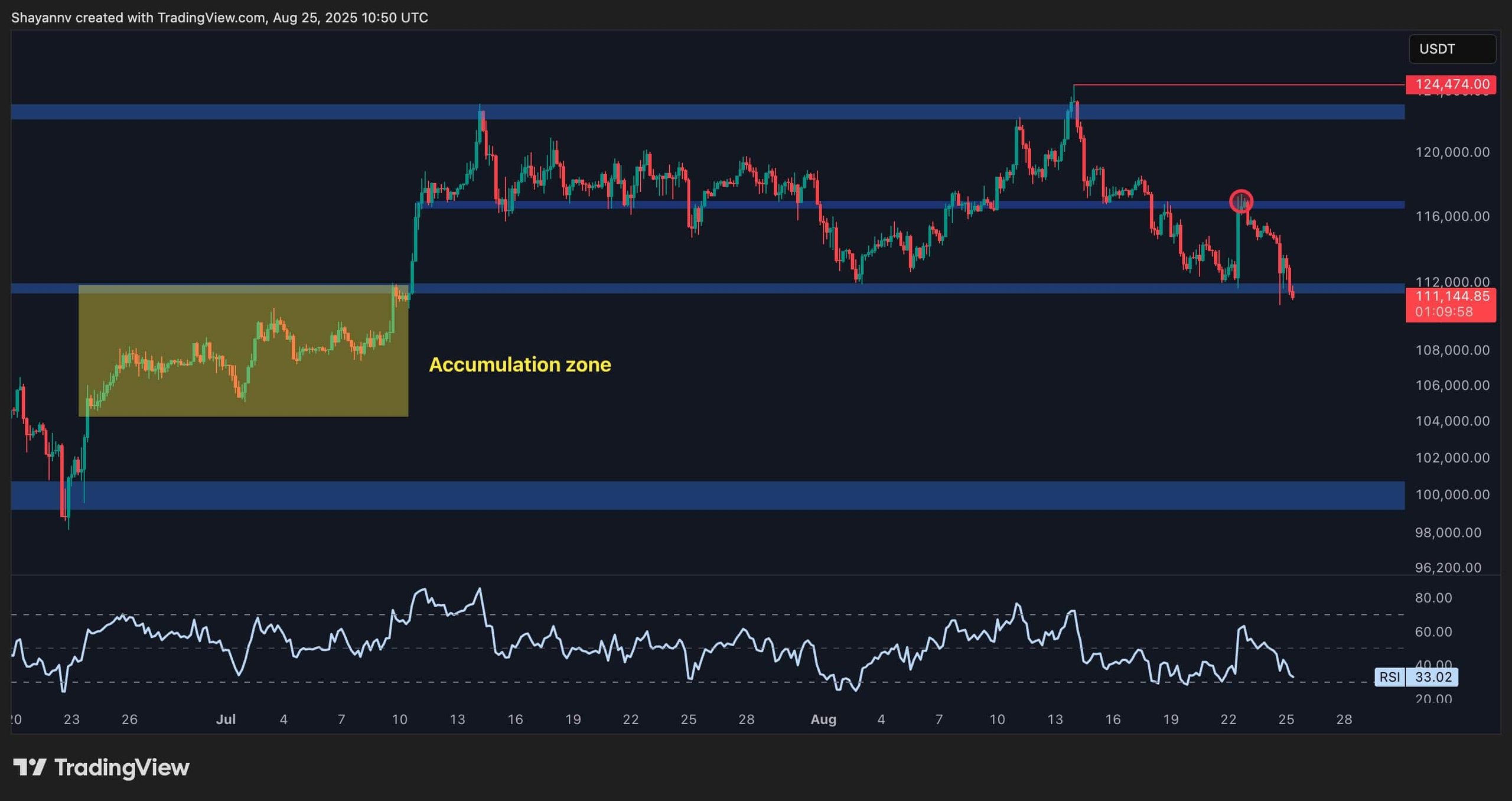 Currently, the $111K support is breaking down, which could pave the way for a swift decline toward the critical $100K zone. While the previous accumulation between $105K and $110K may generate some buying interest and temporary support, the overall market structure points to a higher probability of further downside.
