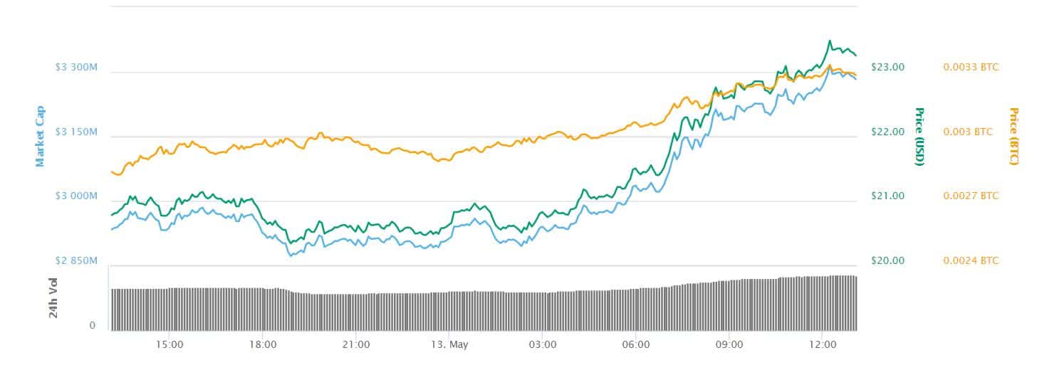BNB is currently up over 10 percent on the day, sitting at a price of $23.11. Interestingly enough, the cryptocurrency performs well against BTC as well. In fact, against Bitcoin, BNB is about 17 percent on the day, currently sitting at 0.0032BTC.