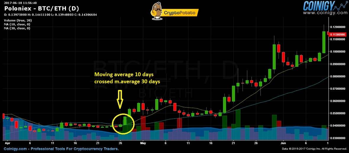 Ein weiteres Werkzeug der technischen Analyse für die Kryptowährungen und die technische Analyse allgemein, ist der gleitende Durchschnitt, welcher die Erkennung von Trends erleichtert. Ein gleitender Durchschnitt basiert auf dem durchschnittlichen Preis der Münze über einen bestimmten Zeitraum. Der gleitende Durchschnitt eines bestimmten Tages wird zum Beispiel gemäß dem Preis der Münze für jeden der vorangegangenen 20 Handelstage berechnet. Wenn man alle gleitenden Durchschnitte verbindet, entsteht eine Linie. Außerdem ist es wichtig den exponentiellen gleitenden Durchschnitt (EMA) zu beachten, ein gleitender Durchschnitt, der in seiner Berechnung die Preiswerte der letzten Tage stärker gewichtet, als die der vorangegangenen Tage. Ein Beispiel ist, dass der Berechnungskoeffizient der letzten fünf Handelstage von EMA 15 Tage doppelt so viel sein wird wie das der vorherigen zehn Tage. In der folgenden Grafik ist ein praktisches Beispiel zu erkennen: Wenn ein 10-Tage-gleitender Durchschnitt sich über einen 30-Tage-gleitenden Durchschnitt bewegt, könnte dies bedeuten, dass ein positiver Trend zu erwarten ist.