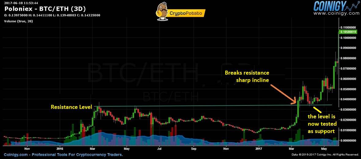 So wie es Trendlinien gibt, gibt es auch horizontale Linien, die den Grad der Unterstützung und des Widerstandes angeben. Indem wir die Werte dieser herausstellen, können wir Rückschlüsse über die momentane Situation von Angebot und Nachfrage der Münze ziehen. Auf einer Unterstützungslinie scheint es eine beträchtliche Anzahl von Händlern zu geben, die gewillt sind die Münze zu kaufen (eine hohe Nachfrage). Sie glauben, dass die Währung auf diesem Level günstig angeboten wird und werden sie daher für diesen Preis kaufen wollen. Sobald eine Münze sich dieser Linie genähert hat, entsteht eine „Grundzahl“ an Händlern. Die hohe Nachfrage beendet meist die Abnahme und ändert manchmal sogar die Dynamik in einen Aufwärtstrend um. Eine Widerstandslinie ist genau das Gegenteil. Ein Bereich in dem viele Verkäufer eine große Angebotszone formen, indem sie dort geduldig mit ihren Bestellungen warten. Jedes Mal wenn sich eine Münze der Obergrenze nähert, findet sie dort den Vorrat vor und geht zurück. Häufig gibt es Situationen, in denen es zu Ausgleichen zwischen Unterstützungs- und Widerstandslinie kommt: wenn man sich nahe den Unterstützungslinien versammelt und dann um die Widerstandslinie verkauft. Diese Möglichkeit tritt normalerweise ein wenn eine Seitwärtsbewegung festgestellt wird. Was passiert also während eines Ausbrechen aus den Widerstands- oder Unterstützungslinien? Das istmit großer Wahrscheinlichkeit Indikator, der den existierenden Trend stärkt. Weitere Stärkung wird dem Trend zuteil, wenn die Widerstandslinie eine Unterstützungslinie wurde und kurz nach dem Ausbrechen von oben getestet wird.