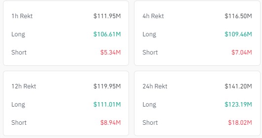 The total number of liquidated positions for the last 24 hours is around $141 million, the majority of which are longs.