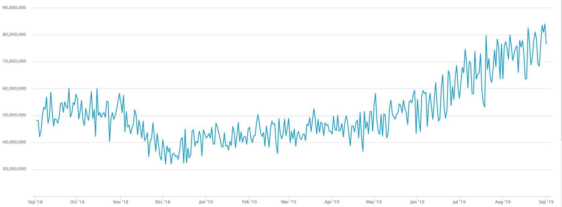 As seen on the chart, Bitcoin’s hashrate managed to top 80 quintillion hashes per second on August 31st, which was an all-time high, showcasing the network’s strength. According to popular Bitcoin proponent Max Keiser, the increasing hashrate and the approaching of 90 quintillion hashes per second sets in motion the protocol’s hard-coded game theory which stipulates that hash power precedes price and that it’s therefore possible for Bitcoin’s price to reach $28,000.