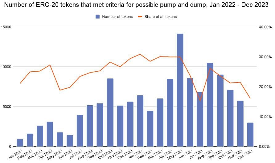 Chainalysis delved into pump-and-dump schemes and discovered that between January and December 2023, slightly over 370,000 tokens were introduced on Ethereum. Of these, around 168,600 were accessible for trading on at least one decentralized exchange (DEX).