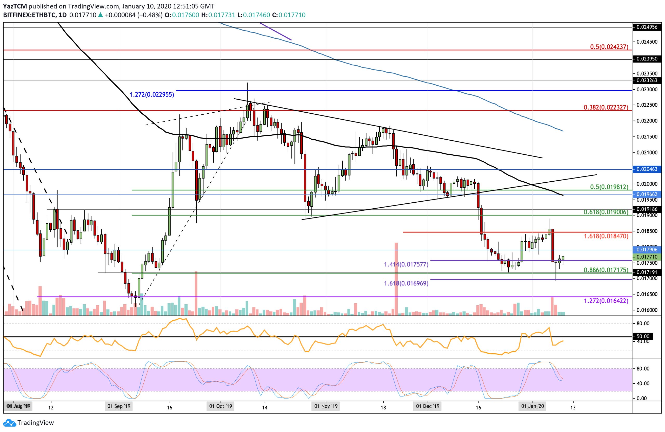 If the bulls can continue to drive ETH higher from here, the first level of resistance is located at 0.0179 BTC. Above this, resistance lies at 0.0185 BTC, 0.019 BTC and 0.01966 BTC (100-days EMA). On the other hand, if the sellers push ETH beneath the support at 0.0175 BTC, the support below is expected at 0.0171 BTC and 0.0169 BTC. Following this, additional support is found at 0.0164 BTC.