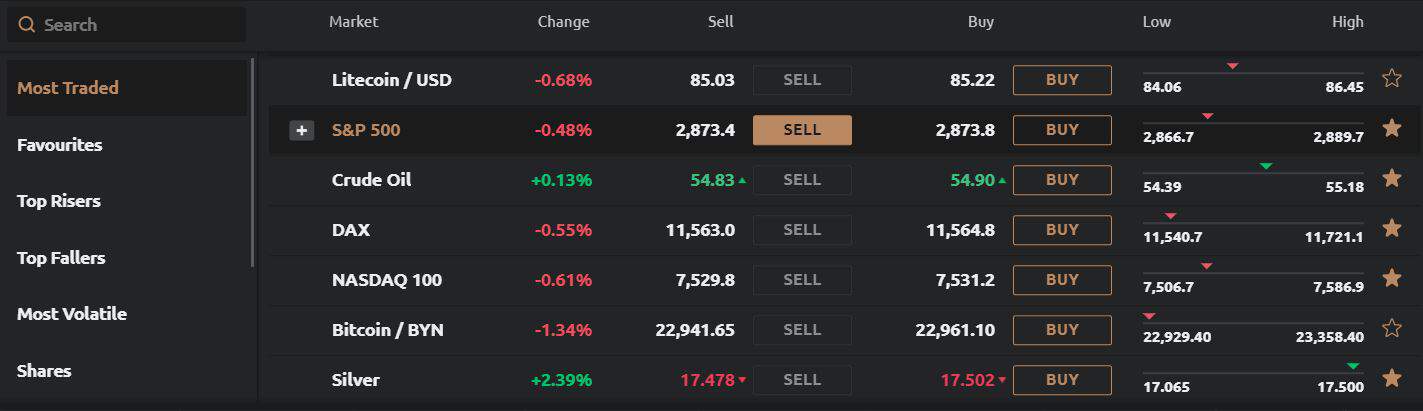 The cryptocurrencies that you can trade with leverage are Bitcoin, Ethereum, Ripple, Bitcoin Cash and Litecoin. You can trade them against the euro, US dollar, Belarusian ruble (BYN) and Russian ruble (RUB). You can also trade them against each other. For instance, there are LTC/BTC and ETH/BTC trading pairs.