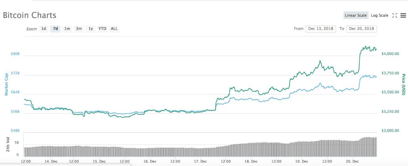 In today’s analysis, we believe there is a positive correlation between the Federal reserves recent decision to raise interest rates by 2.5%, and Bitcoins price jumping back to $4k from $3,200.