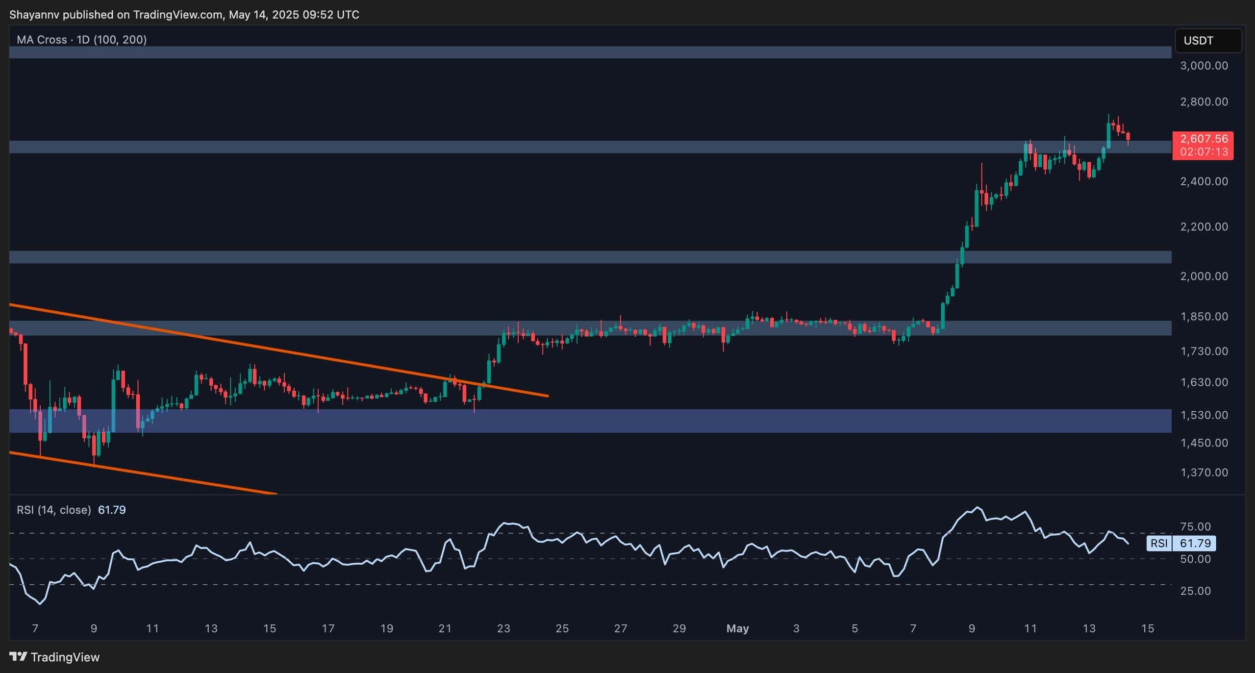 The RSI is also now in overbought territory, printing above 75, hinting at potential exhaustion. A daily close above $2.7K would confirm a bullish breakout and open the door to $3K+, while rejection from this level could pull ETH back toward the $2.2K support level.