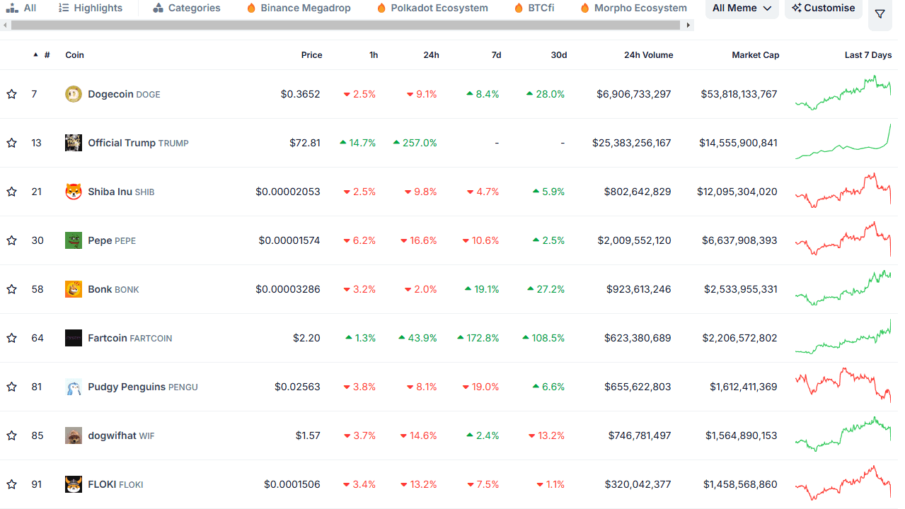 But its rise has been met with the demise of many alternatives. CoinGecko’s meme coin chart shows that almost all competitors have bled out since TRUMP’s launch on Friday evening. On a daily scale, DOGE is down by over 9%, SHIB has plummeted by 10%, and PEPE has slumped by over 16%.