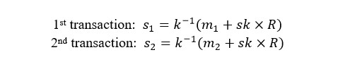 Consider what happens when two transactions are signed using the same random number ‘k’. Since ‘k’ is used to derive ‘R’, the ‘R’ value of the two transactions will also be the same. Let’s call these two signatures (s1) and (s2).