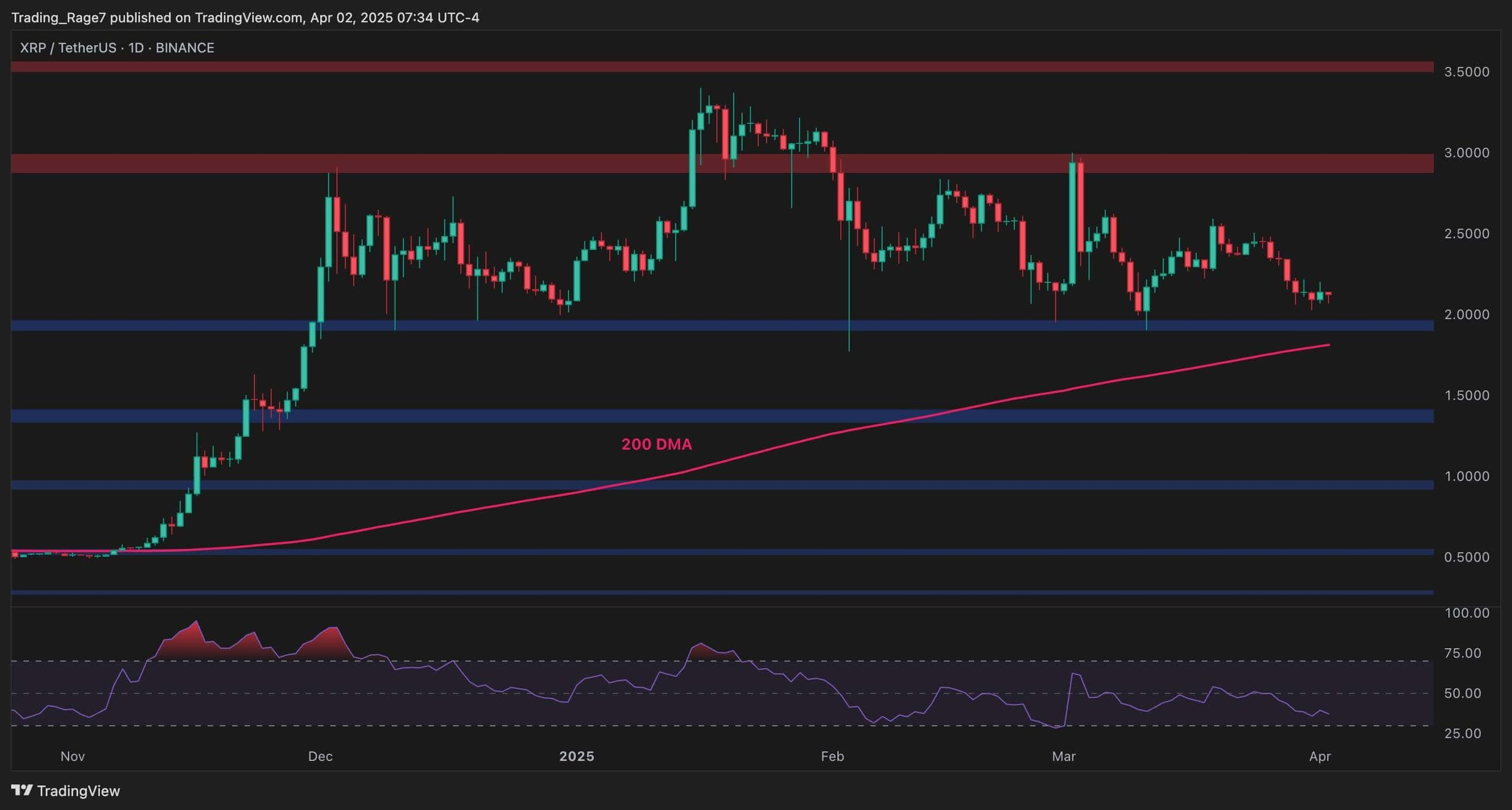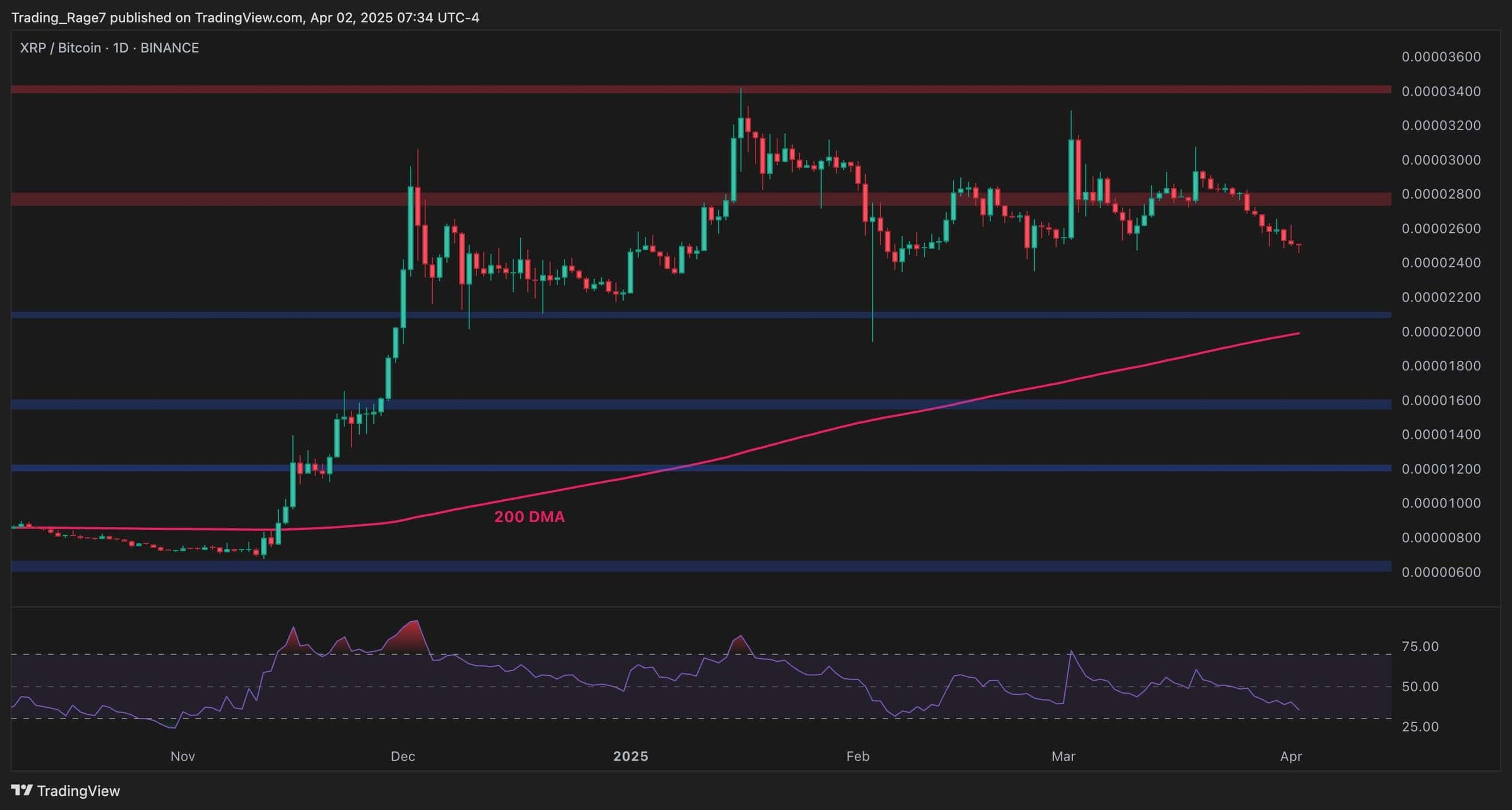 The 200-day moving average at approximately 2,000 SAT remains intact, indicating that, similar to the USDT pair, the broader uptrend is still in play. Yet, the RSI is trending lower, suggesting a potential weakening of momentum, but as long as XRP holds above 2,000 SAT, a bullish continuation above the 3,000 SAT area could be expected.