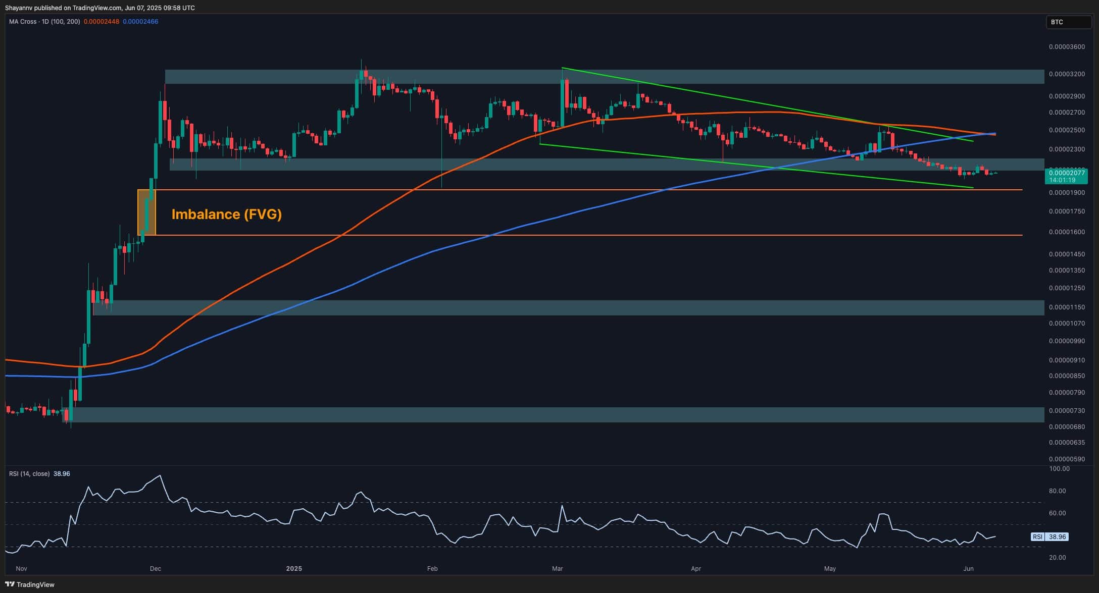 The XRP/BTC pair is trading around the 2,100 SAT mark after a prolonged grind lower within a descending wedge structure. Once again, the price has lost both the 100-day and 200-day MAs, which have also created a bearish crossover around the 2,500 SAT mark, and is now hovering above the lower channel boundary and the 2,000 SAT demand zone.