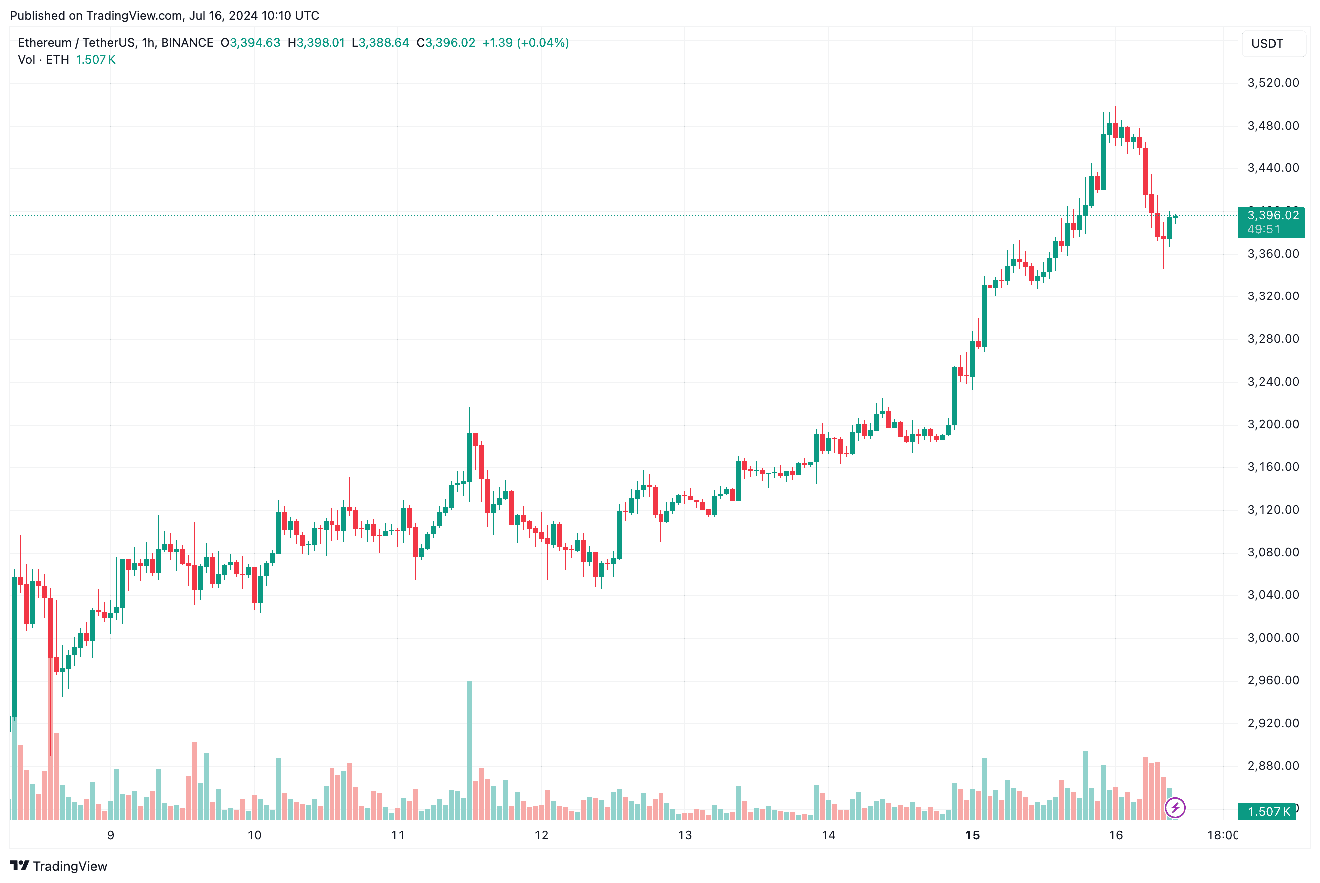 Ethereum’s price has risen almost 10% in the past seven days. It is currently trading slightly below the important $3,400 mark.