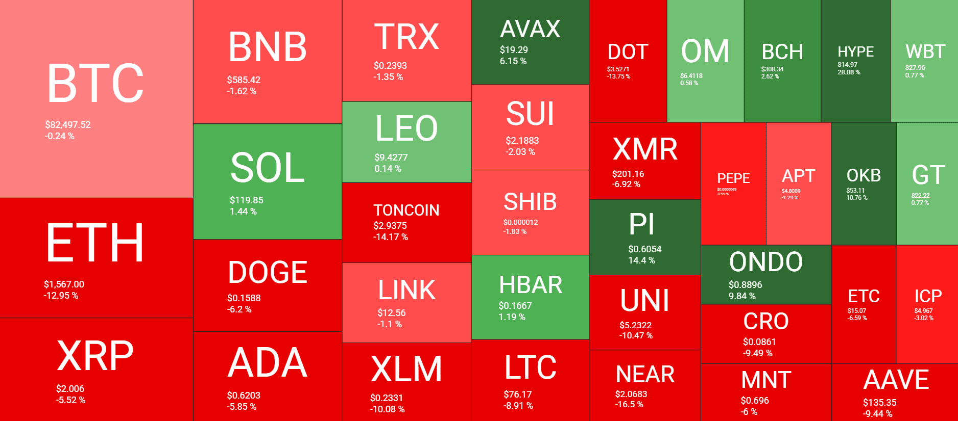 BTC: $82,450 (-0.2%) | ETH: $1,568 (-13%) | XRP: $2 (-5.5%)