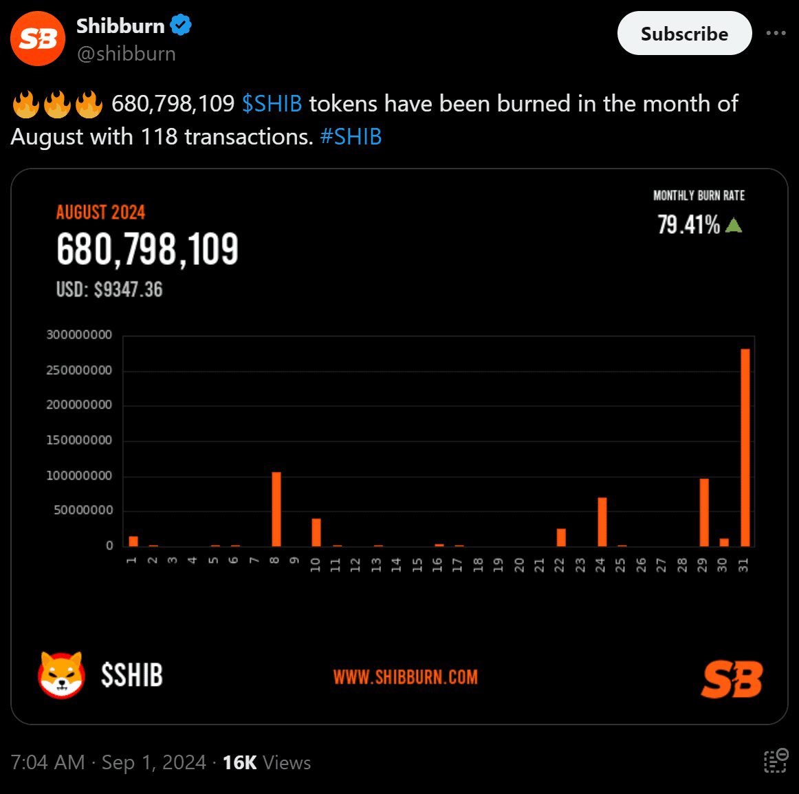 Shibburn data shows over 680 million SHIB tokens were destroyed with 118 transactions last month. This represents a 79% increase compared to the burnt amount in July. The record day was August 31, when almost 300 million tokens were removed from circulation.