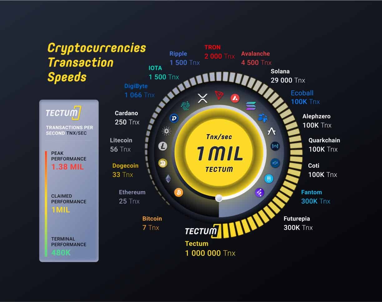 The Tectum Blockchain is capable of handling over a million transactions per second called “EVENTS,” according to its official website. It also provides quick event status delivery, as well as ownership updates across the network, along with distributed levels of access to functional system modules.