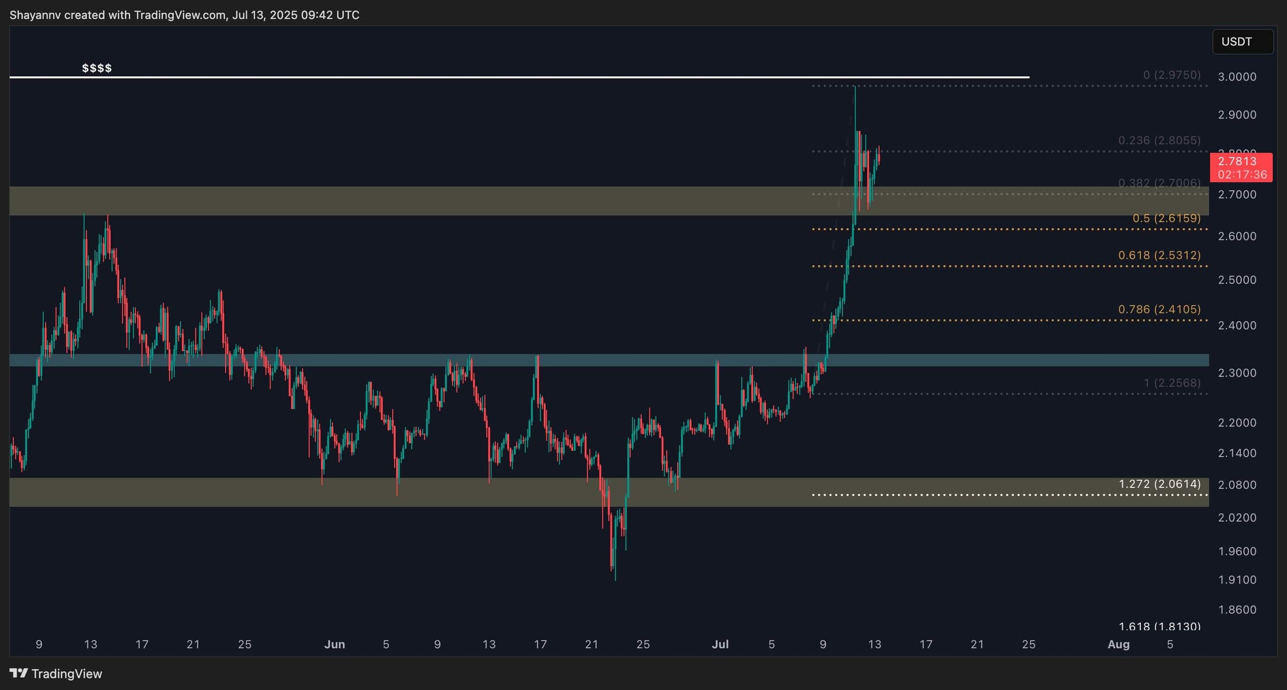 However, this critical price level is now acting as a formidable resistance, and selling pressure is beginning to emerge. As a result, a short-term consolidation or pullback is likely to unfold before any continuation of the uptrend. For Ripple to maintain its bullish structure and aim for a new all-time high, reclaiming and holding above the $3 threshold will be essential.