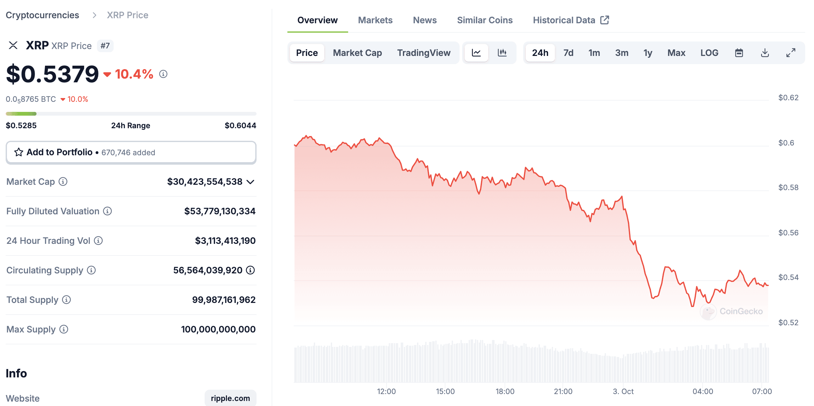 The asset was trading above $0.60 on Oct. 2 but crashed to bottom out at just below $0.53 during early trading in Asia on Thursday morning.
